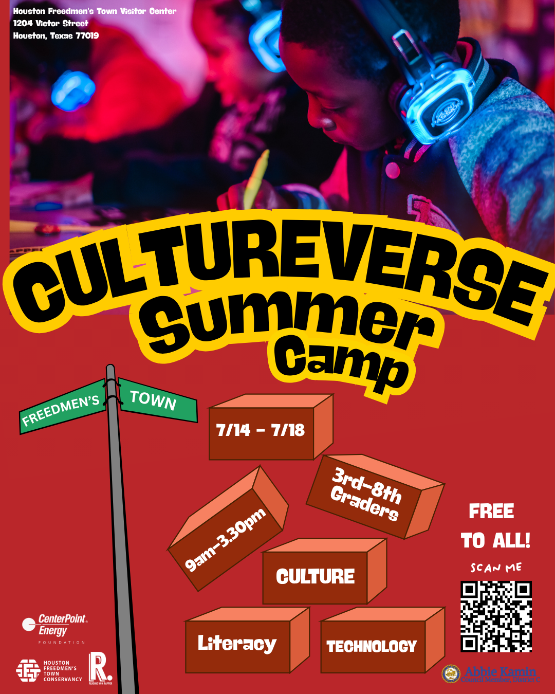 For 3rd–8th graders, this program blends hip-hop culture with literacy, music, and technology to make learning fun and relatable for under-resourced youth. By creating and analyzing songs about Freedmen’s Town, students build literacy skills and explore local history through hands-on activities. This curriculum is designed to bridge educational gaps, boost digital access, and ensure students from historically marginalized communities receive high-quality learning experiences.